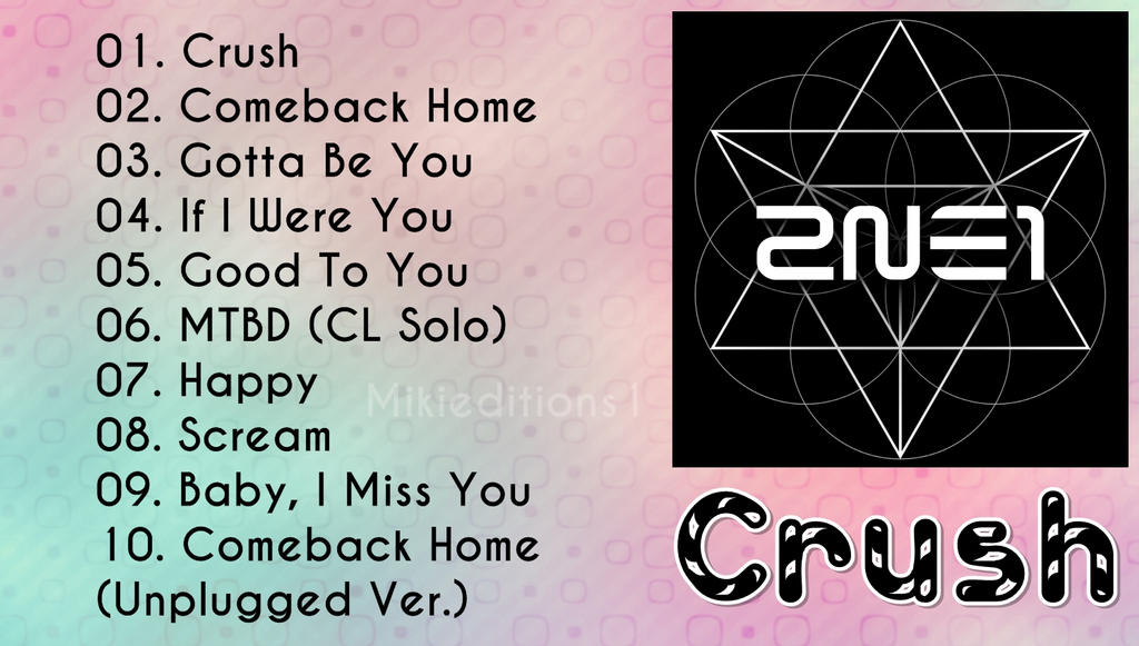 03 너 아님 안돼. Crush is the second and final Korean studio album and third and final studio album overall by South Korean girl group 2NE1It is the groups first album release since 2011s 2nd Mini Album and second full-length album following 2010s To AnyoneProduction of the album was handled mainly by Teddy with contributions from Choice 37 DeeP Masta Wu Choi Pil Kang and Peejay as well as the groups. This album includes 10 new tracks with 2 written by the leader CL.